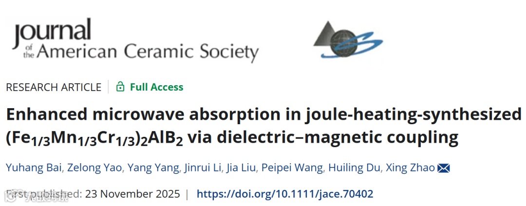 面对5G/6G时代严峻的电磁污染挑战,西安科技大学赵幸团队在陶瓷材料顶级期刊《Journal of the American Ceramic Society》(JCR Q1区)上发表创新研究成果。该研究通过焦耳加热快速烧结技术,成功制备出三元MAB相固溶体(Fe₁/₃Mn₁/₃Cr₁/₃)₂AlB₂,在仅1.47毫米厚度下实现了-58.38 dB的最小反射损耗与4.0 GHz的最大有效吸收带宽,性能较传统材料提升3倍以上!这项突破为下一代“薄、轻、宽、强”吸波材料的设计与制备提供了全新解决方案。