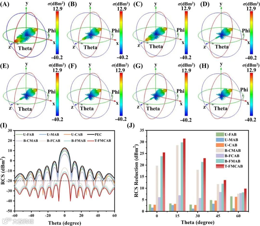 三维RCS图(图8A-H)清晰显示,涂覆T-FMCAB材料后电磁散射显著减弱。二维RCS曲线(图8I)表明在-60°至60°宽角度范围内均保持优异性能,RCS缩减值最高达31.41 dB·m²(图8J),证明其在实际应用中的巨大潜力。