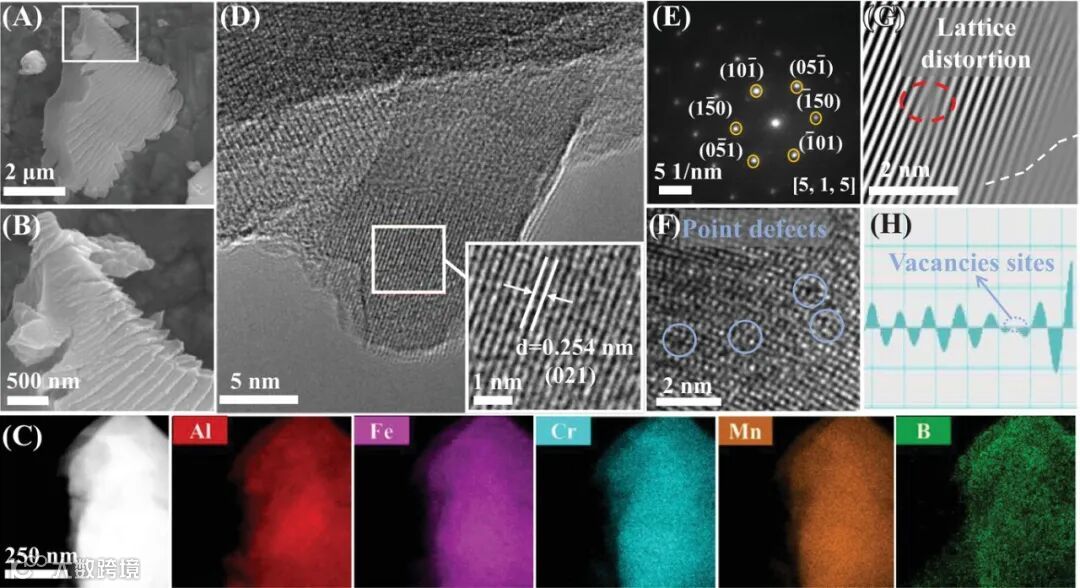 SEM图像(图3A-B)显示材料具有致密层状结构。HAADF-STEM及元素分布(图3C)证实各元素均匀分布。HRTEM(图3D,F)与SAED(图3E)显示清晰的晶格条纹与衍射斑点,IFFT分析(图3G-H)揭示丰富的空位缺陷。