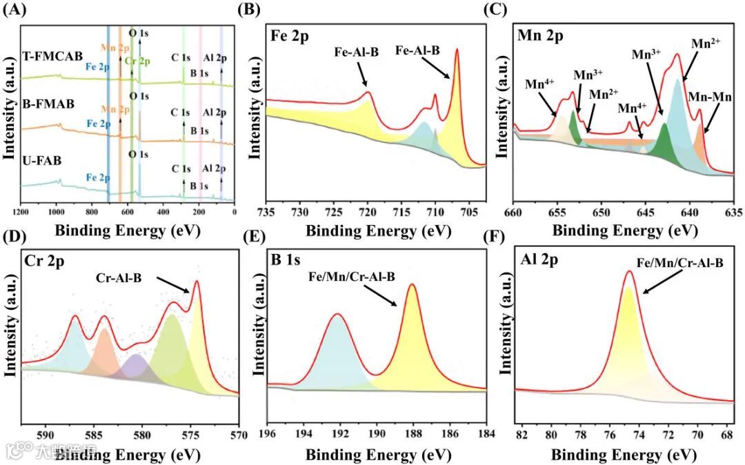 XPS全谱(图2A)显示T-FMCAB具有预期的元素组成。高分辨率谱图(图2B-F)揭示Fe、Mn、Cr均以多价态存在,B和Al与金属元素形成强键合,为电磁损耗提供丰富活性位点。