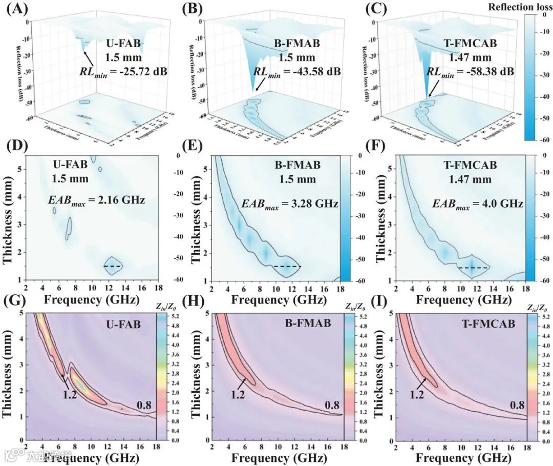 三维反射损耗曲线(图5A-C)显示T-FMCAB在1.47mm厚度下达到-58.38dB的最佳性能。二维等高线图(图5D-F)与阻抗匹配图(图5G-I)证实其具有宽频强吸收特性。