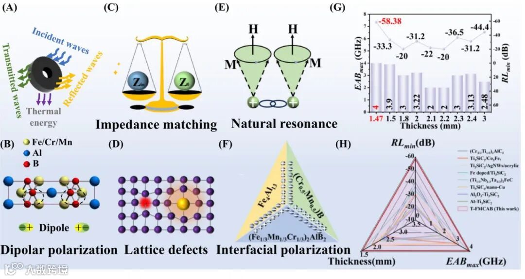 电磁波吸收机理示意图(图9A-F)系统揭示介电-磁耦合、多重极化、晶格畸变等多机制协同作用。性能对比图(图9G-H)显示T-FMCAB在厚度-性能综合指标上超越大多数已报道吸波材料,达到国际先进水平。