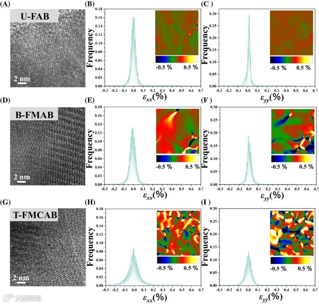 GPA应变分析显示,与U-FAB(图4A-C)和B-FMAB(图4D-F)相比,T-FMCAB(图4G-I)具有更高的晶格应变,这源于多元素掺杂引起的晶格畸变,有利于增强界面极化。