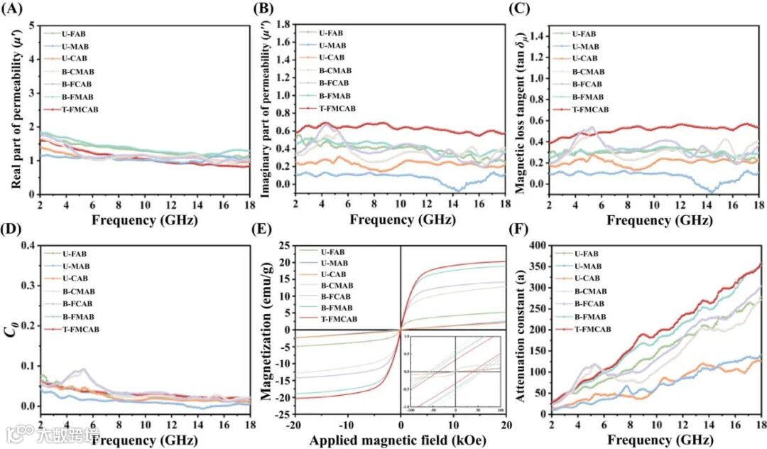 复磁导率实部(μ′)与虚部(μ″)谱图(图7A-B)显示T-FMCAB具有增强的磁响应能力。磁损耗角正切(tan δμ)在特定频段出现明显共振峰(图7C),C0曲线(图7D)与磁滞回线(图7E)证实材料具有良好的软磁特性。衰减常数(α)在X波段达到峰值(图7F),展现卓越电磁波衰减能力。