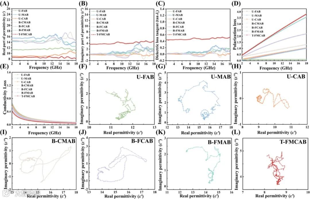 复介电常数实部(ε′)与虚部(ε″)曲线(图6A-B)显示T-FMCAB在整个频段内保持最优值。介电损耗角正切(tan δₑ)在8-12 GHz范围内显著增强(图6C),极化损耗与电导损耗分析(图6D-E)及Cole-Cole图(图6F-L)证实多重极化机制共存。