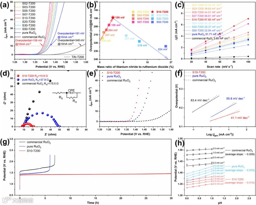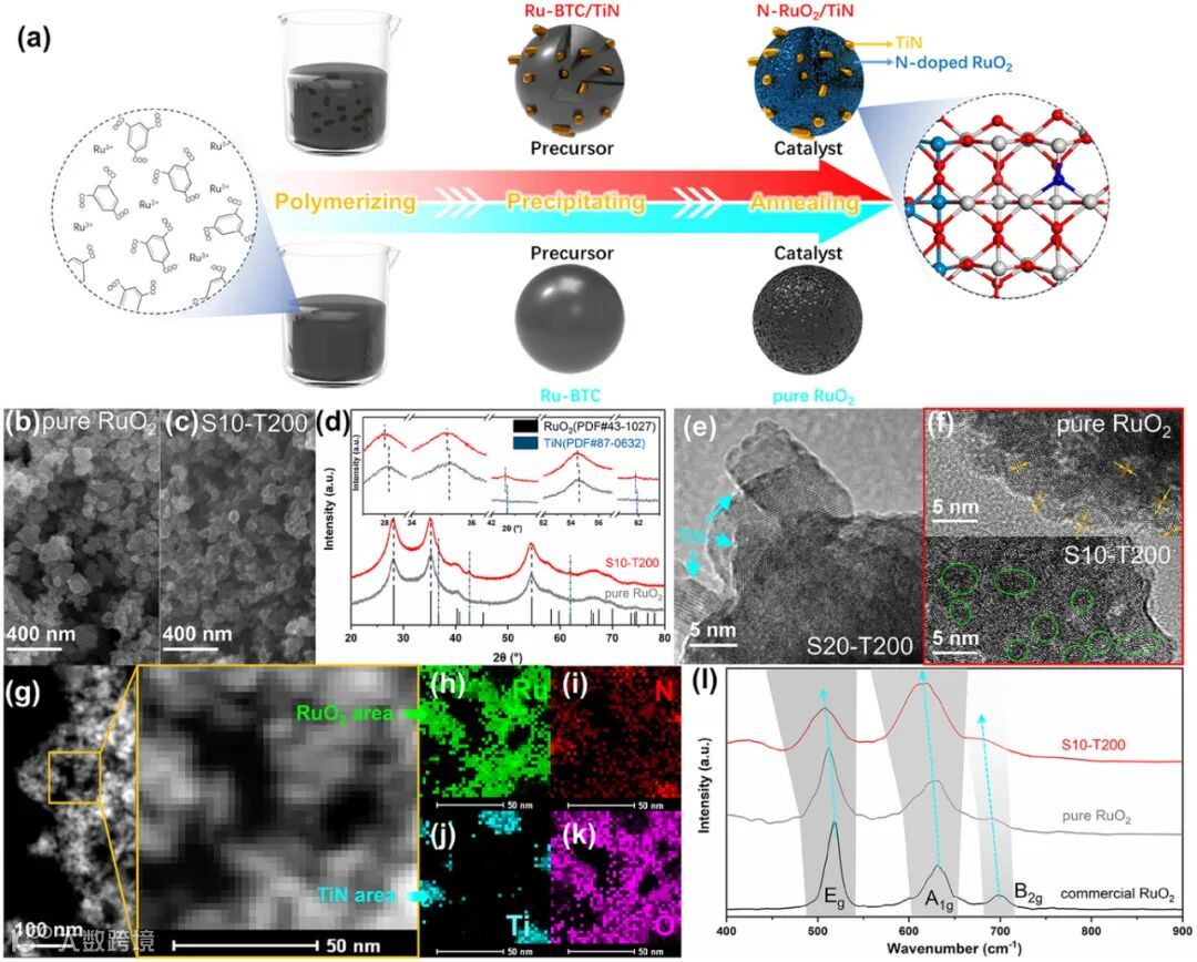 创新催化剂设计 :提出 N-RuO₂/TiN 复合催化剂,通过以 TiN 纳米颗粒为氮源,结合低温退火工艺制备超小尺寸氮掺杂 RuO₂纳米晶,并构建 Ru-O-Ti 界面桥结构,从材料结构设计上解决钌基催化剂稳定性难题。