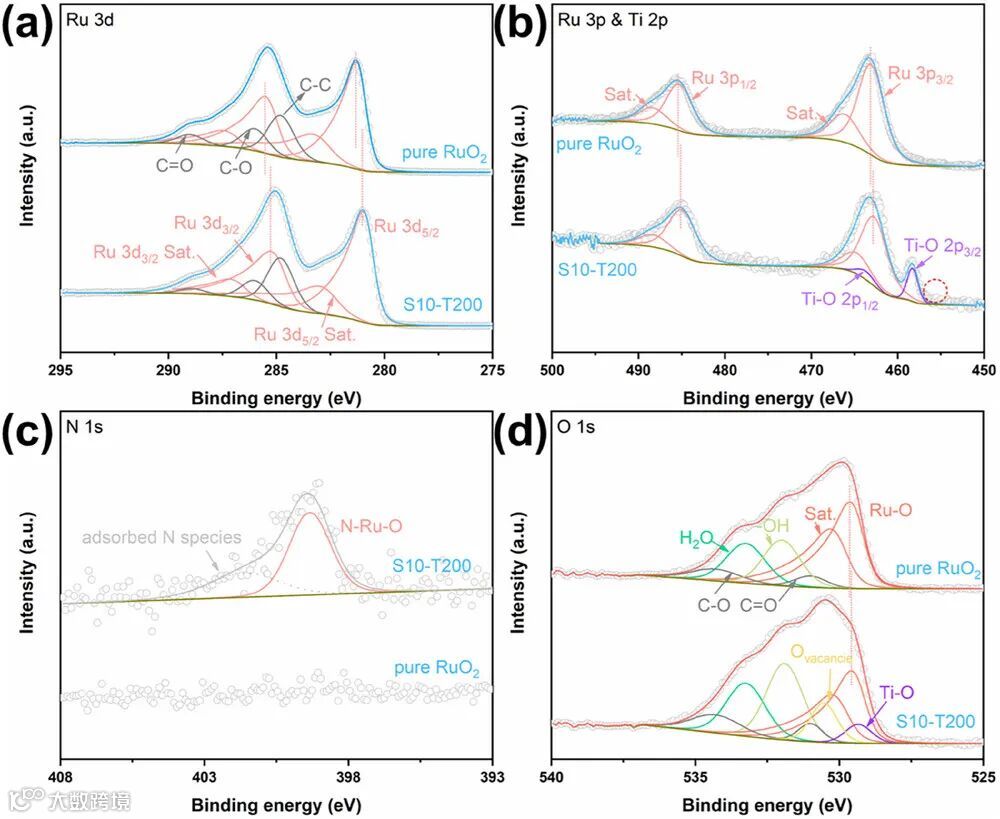 图 2 通过 XPS 和 ESR 揭示 N 掺杂与界面效应对电子结构的调控作用。Ru 3d/3p 谱结合能负移表明 N 原子向 Ru 位点注入电子,降低氧化态并增强金属 - 载体相互作用。N 1s 谱和 O 1s 谱及相关信号证明缺陷形成。界面 Ru-O-Ti 桥结构通过 Ti 的电子供体效应进一步优化 Ru 位点电荷分布,协同削弱 Ru-O 共价性,抑制晶格氧流失。