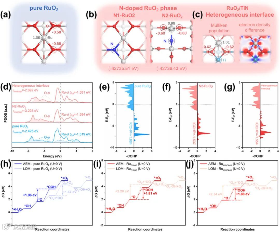 图 4 通过 DFT 计算揭示 N 掺杂和 Ru-O-Ti 界面结构的协同效应。氮掺杂使 Ru 的 Mulliken 电荷降低,d 带中心负移,削弱了 Ru 与氧中间体的吸附强度,优化 AEM 途径决速步。界面 Ru-O-Ti 结构中,Ti 通过氧桥向 Ru 位点供电子,进一步降低 Ru 的氧化态。Ru-O 键的 ICOHP 值表明 Ru-O 共价性减弱,抑制晶格氧流失。理论计算与实验数据一致,阐明电子结构调控对活性与稳定性的提升机制。