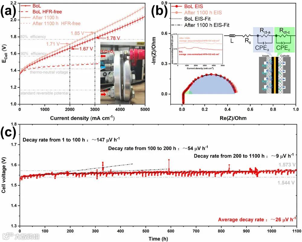 卓越电化学性能 :所获催化剂在 0.5 M H₂SO₄ 中展现 159 mV@10 mA cm⁻² 的低过电势,在 1100 小时持续运行中电压衰减率仅为 26 μV h⁻¹,在 3 A cm⁻² 工业级电流密度下电解槽仅需 1.78 V 电压,性能超越现有铱基体系,展现出良好的工业应用前景。