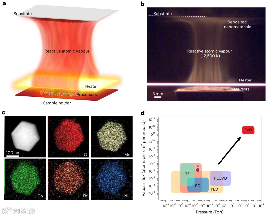 图1a-b展示了EVD反应器的核心设计:利用通电碳纸产生~3000 K的超高温,将下方前驱体“瞬间气化”为高通量原子蒸气(1021–1022 atoms/cm²/s),蒸气在浮力作用下向上流动,在低温基底上沉积成材。图1c-d通过元素分布图和对比结果证实,该方法能合成元素分布均匀的多元纳米材料(如Mo₄₅Co₂₅Fe₁₅Ni₁₅Oₓ),其蒸气通量远超传统真空技术,彰显了其在高效、低成本合成方面的巨大潜力。