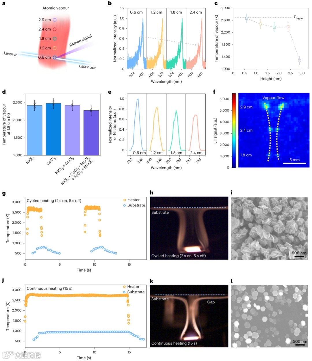 研究团队采用多种先进原位光谱手段(图3a-f)实时监测合成过程。发现蒸气在靠近加热器区域温度接近2600 K,并确认了纳米颗粒在气相中成核并生长的机制。图3g-l进一步指出,将基底温度控制在约600 K是实现高效沉积的关键,温度过高会因热泳效应导致沉积效率下降。