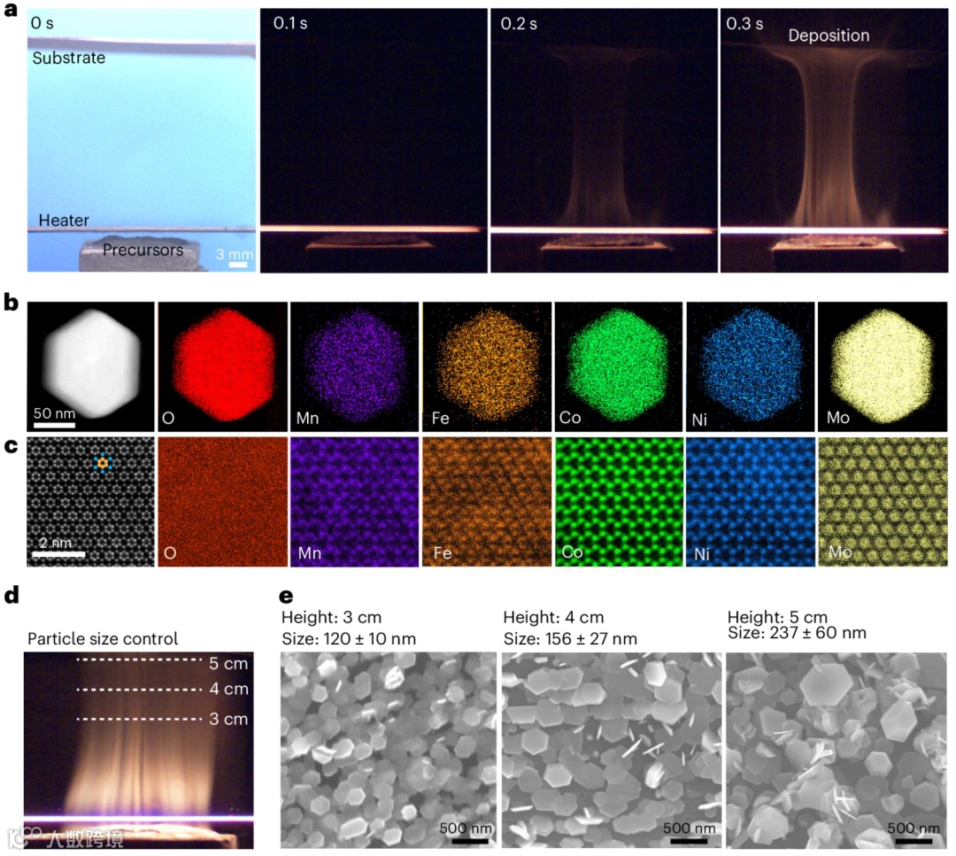 图2a-c通过高分辨电镜和原子级成像,揭示了所合成纳米盘(如Mo₄₅Co₂₅Fe₁₀Ni₁₀Mn₁₀Oₓ)具有完美的单晶结构和有序的元素占位。图2d-e则证明,通过简单调节基底高度,可实现纳米盘尺寸在120纳米至237纳米之间的精确调控,展现了该方法优异的形貌控制能力。