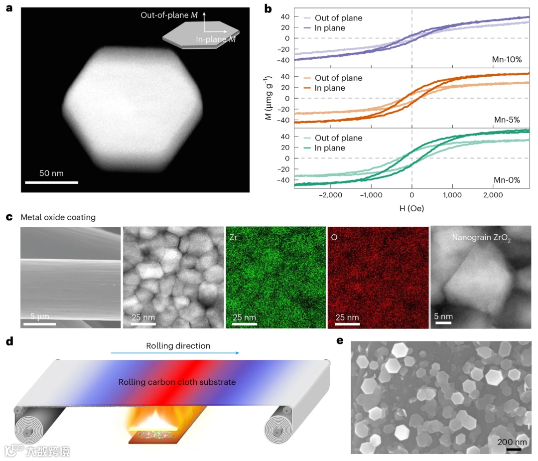 图4a-b展示了通过调控组分,可有效调节纳米盘的磁各向异性,在纳米电机、磁存储等领域有应用前景。图4c显示了EVD制备的ZrO₂薄膜具备连续均匀的纳米晶结构。尤为重要的是,图4d-e成功展示了利用卷对卷系统在碳布上大规模沉积纳米材料,证明了EVD技术迈向工业化连续生产的可行性。