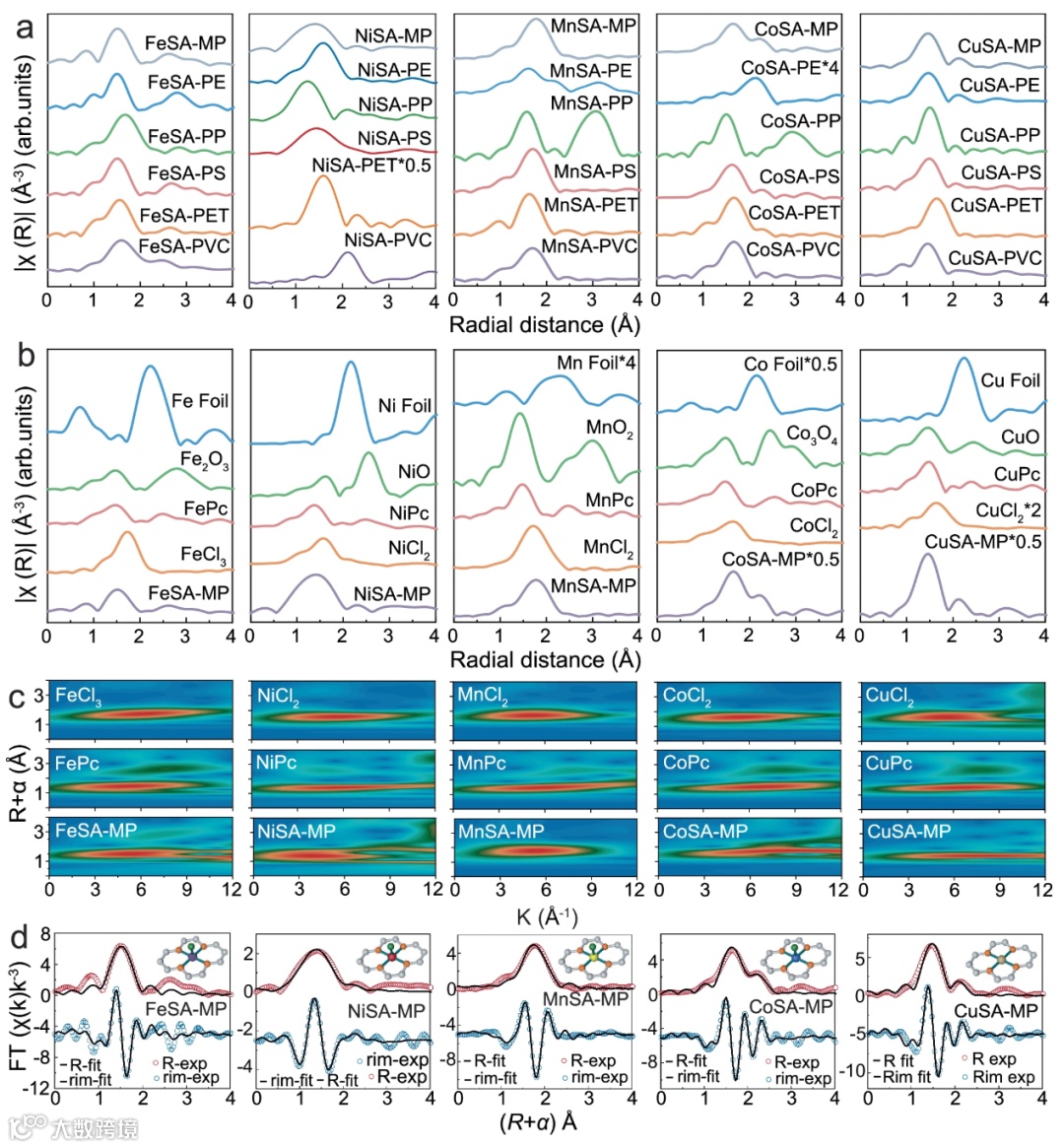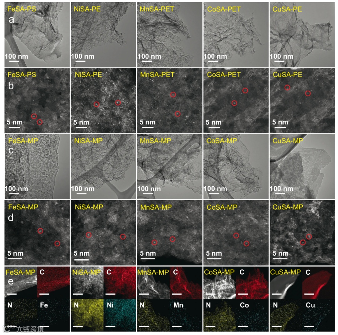 图1展示了以过渡金属氯化物为模板和催化剂,在氨气氛下高温热解多种塑料并进一步酸洗纯化,获得结构规整的SACs的合成路径。该方法对单一塑料及混合塑料均适用,显示出良好的原料适应性。
