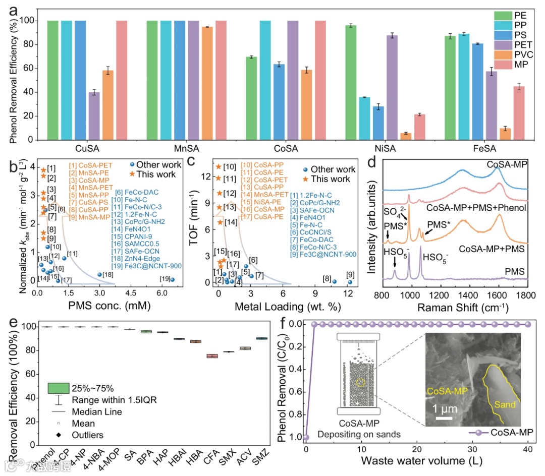 图5显示塑料源SACs在过硫酸盐活化降解酚类污染物中表现出卓越活性,在宽pH范围(3–11)和复杂水质背景中仍保持接近100%的酚类去除率,并展现出以非自由基电子转移机制为主的反应路径。在连续流固定床反应器中处理40升含酚废水仍保持完全去除率,凸显其实际应用潜力。