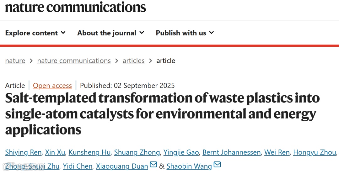 塑料污染治理和资源化利用是当前环境领域面临的重大挑战。近日,阿德莱德大学王少彬教授和段晓光副教授团队在Nature Communications上发表重要研究成果,开发了一种通用的盐模板策略,成功将多种废弃塑料转化为高性能单原子催化剂(SACs),为废塑料的高值化利用和先进催化材料的绿色制备提供了新途径。