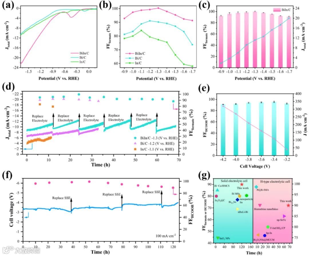 LSV曲线显示BiIn合金膜具有最正的起始电位。最令人印象深刻的是其在两种电解池中的表现:在H型池中于-1.3 V电压下,甲酸盐法拉第效率接近100%;在更接近工业应用的固态电解质池中,于-100 mA·cm⁻²电流密度下稳定运行120小时,甲酸选择性始终保持在90%以上,数据全面优于大多数已报道的催化剂。