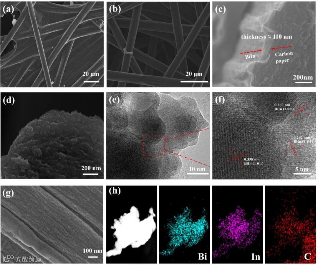 SEM图像清晰显示,经焦耳加热处理的碳纸表面覆盖了一层褶皱状、致密连续的纳米薄膜,与光滑的原始碳纤维形成鲜明对比。HRTEM图像进一步确认了薄膜的晶体结构,EDS元素面扫描图则证明了Bi与In原子在膜内达到了原子尺度的均匀混合,这是其高性能的结构基础。