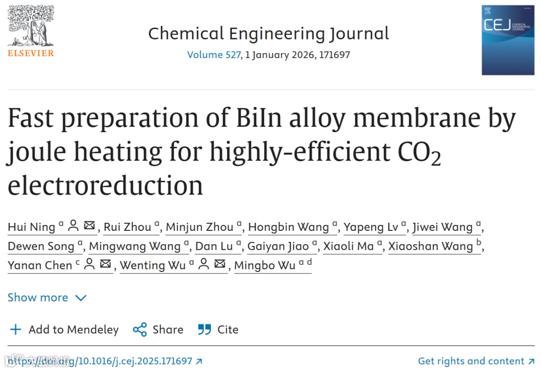 Hui Ning, Rui Zhou, Minjun Zhou, et al. Fast preparation of BiIn alloy membrane by joule heating for highly-efficient CO2 electroreduction. Chemical Engineering Journal, 2026, 527, 171697.