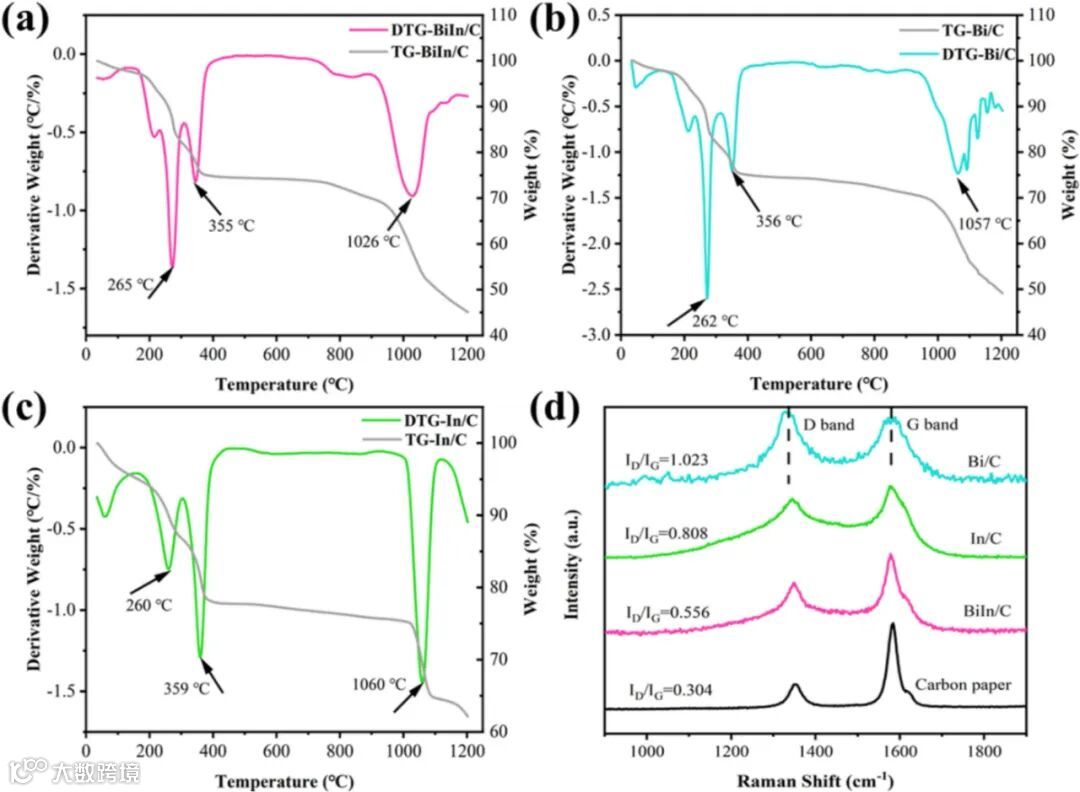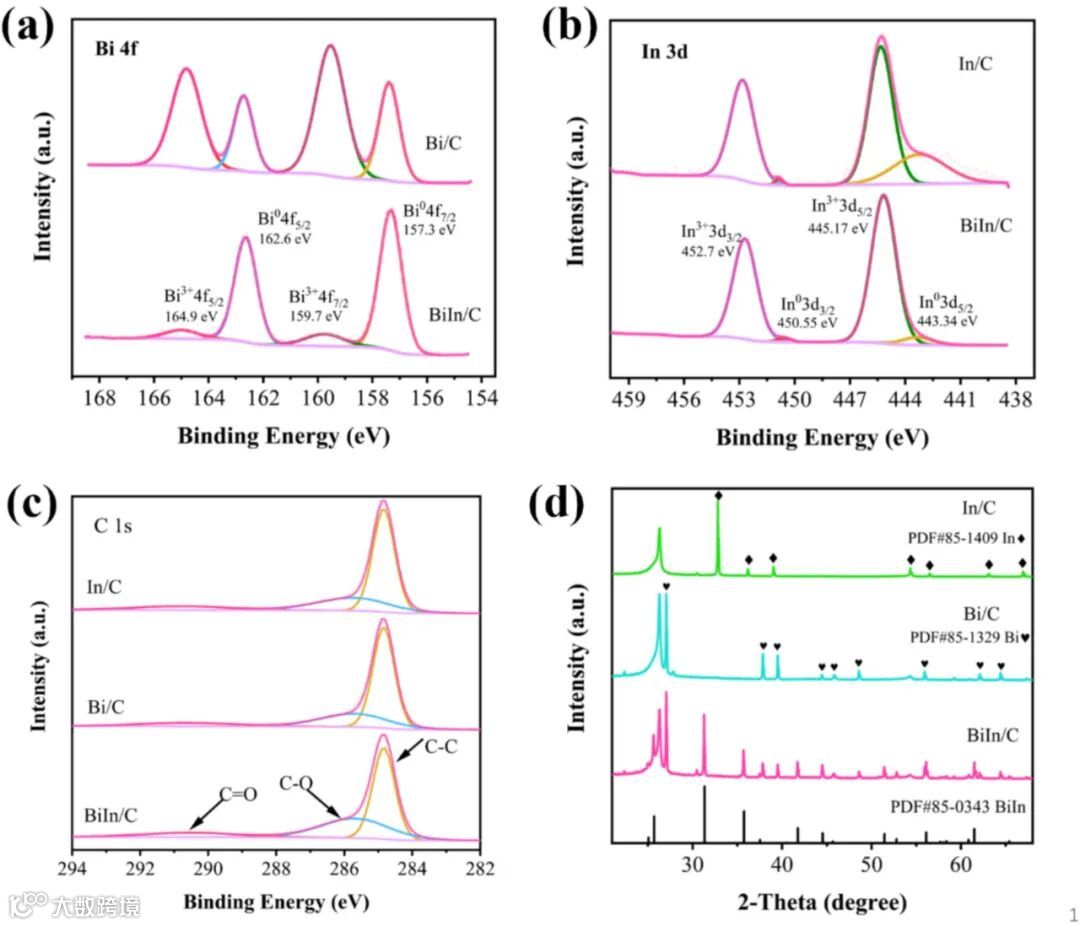 热重分析表明,BiIn合金的前驱体还原温度低于单金属,从热力学上证实了合金化更易进行。XPS分析揭示了性能提升的电子机制:合金中In的电子向Bi转移,形成了独特的电子协同效应,优化了催化中心的电子结构,从而提升了本征活性。