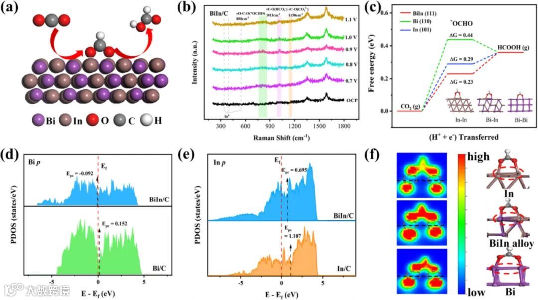 研究通过原位拉曼光谱在808 cm⁻¹处捕获到关键反应中间体•OCHO的信号,其在合金膜上的信号强度远高于单金属,说明合金表面对该中间体具有更强的稳定作用。DFT计算进一步从理论上阐明,Bi-In双位点能最优地调控p带中心,显著降低CO₂还原至甲酸的反应能垒,从原子尺度阐明了高选择性根源。