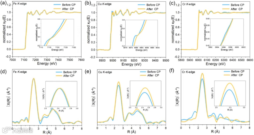图5展示了FeCoNiCuCr在计时电位(CP)测试前后的XAFS数据变化,进一步证实了其在长期使用过程中保持了良好的结构稳定性,且没有显著的氧化态变化。