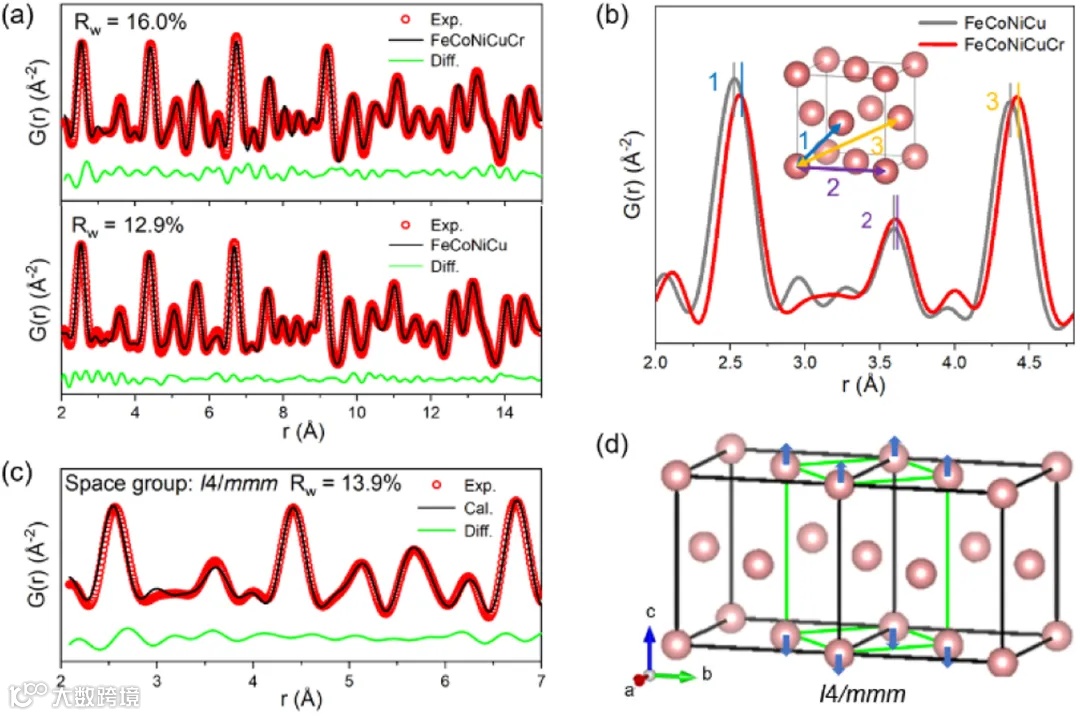 图2通过同步辐射PDF数据揭示了FeCoNiCuCr的局部结构特征。与FeCoNiCu相比,FeCoNiCuCr在局部结构上展现了四方畸变,打破了面心立方结构的对称性。该畸变为材料提供了更多的活性位点,增强了电催化性能。