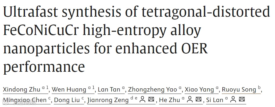 2025年1月14日,南京理工大学的兰司、朱贺教授和中国科学院上海应用物理研究所的曾建荣研究员等在《Chinese Chemical Letters》期刊上发布了题为“Ultrafast synthesis of tetragonal-distorted FeCoNiCuCr high-entropy alloy nanoparticles for enhanced OER performance”的研究论文。该研究提出了一种创新的超快速碳热冲击(CTS)方法,成功合成了FeCoNiCuCr高熵合金纳米颗粒,并实现了其在氧气进化反应(OER)中的卓越电催化性能。这一研究为非贵金属OER电催化剂的开发提供了新思路,同时也为高效能源转换技术的应用前景开辟了新途径。