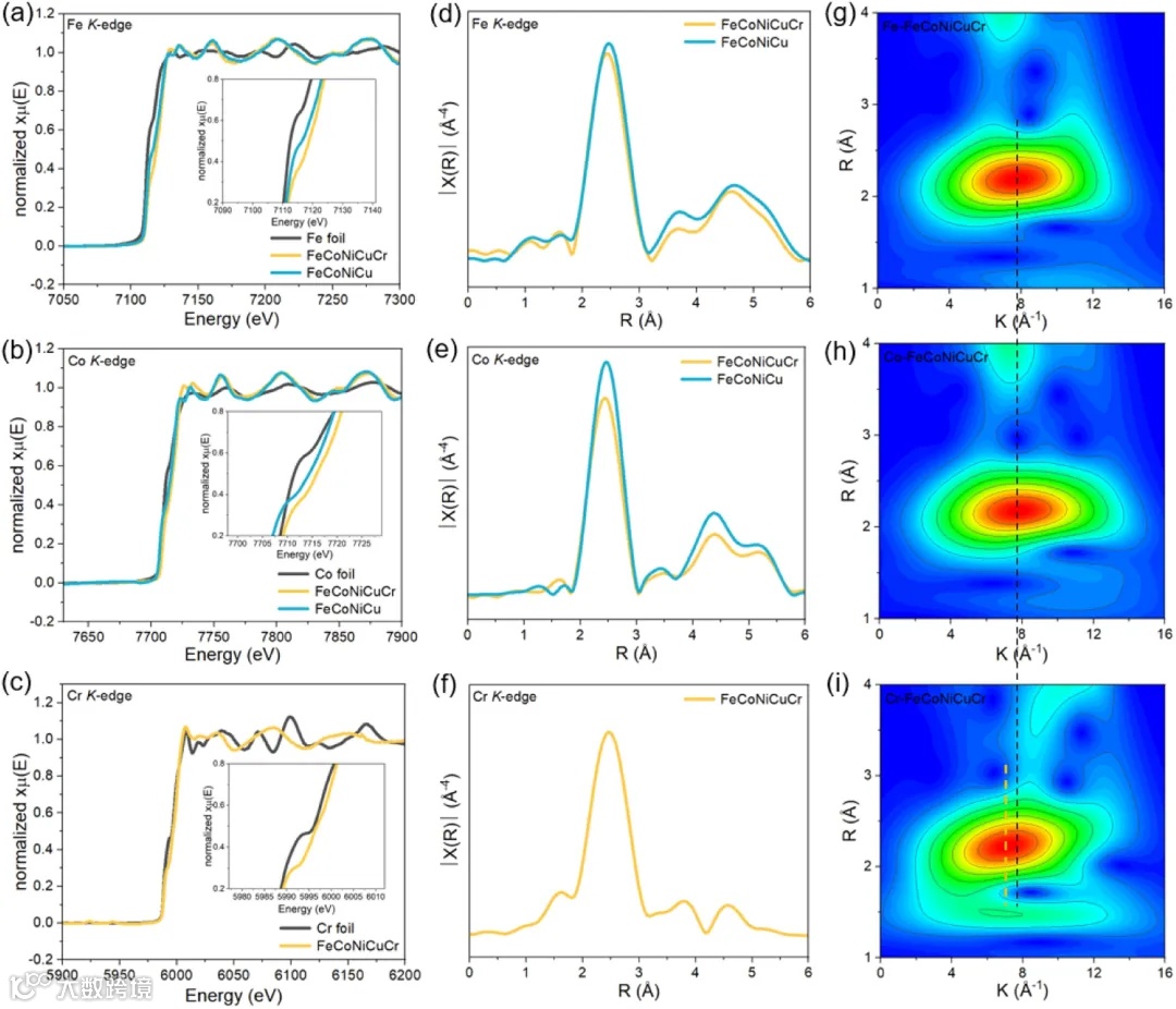 图3展示了FeCoNiCuCr和FeCoNiCu合金的XANES分析结果,表明Cr的加入有效调节了过渡金属的氧化态,从而促进了羟基氧化物的形成,提升了催化活性。