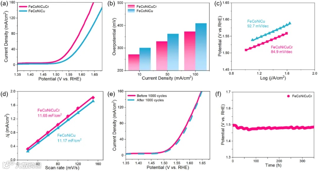 图4通过极化线性扫描伏安法(LSV)曲线评估了FeCoNiCuCr在1 M KOH溶液中的电催化性能。结果表明,FeCoNiCuCr需要较低的过电位就能达到相同的电流密度,展示了优越的催化性能。此外,FeCoNiCuCr表现出显著的电化学稳定性,在长时间操作后仍能维持高性能。