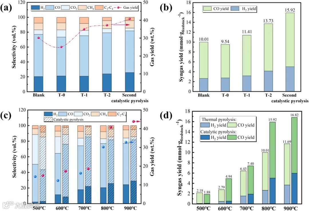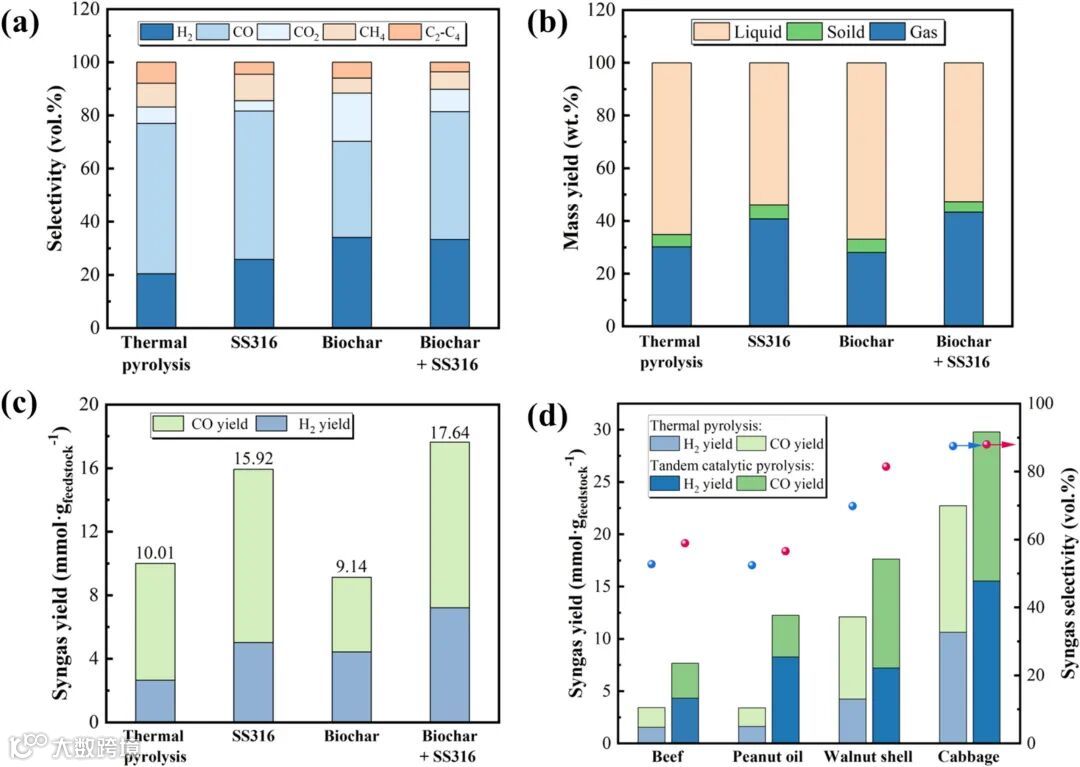 图4:顺序催化法的有效性对比。顺序催化系统在合成气产率和选择性方面均优于单独使用SS 316催化剂或生物炭催化剂。