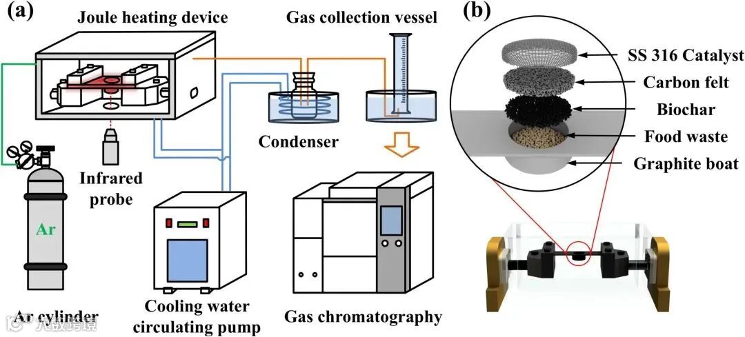图1:热解-催化实验系统示意图。展示了焦耳加热装置、红外探测器、氩气供应系统等设备的配置,以及食物垃圾与催化剂的混合比例。