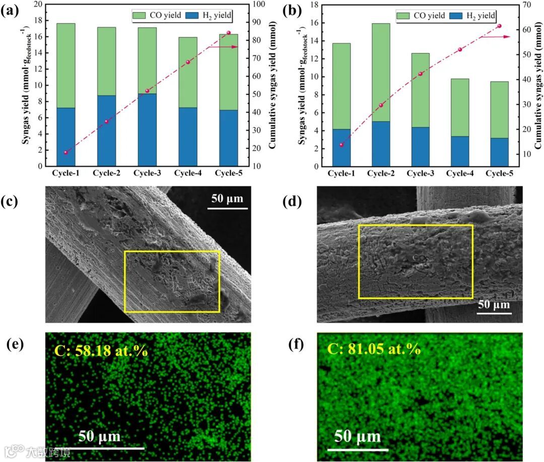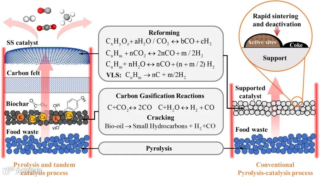 图6:热解和顺序催化过程的机理对比。通过减少积碳,顺序催化系统提高了催化活性和合成气产量。