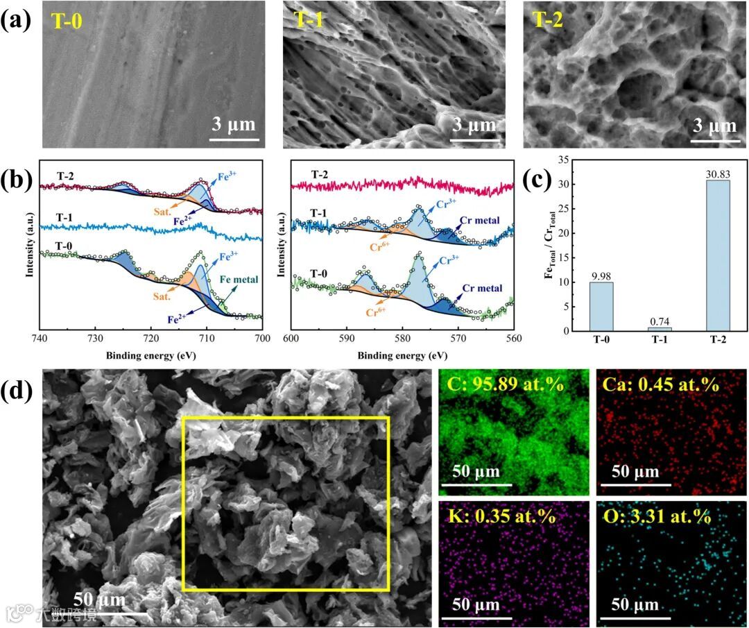 图2:SS 316催化剂的表面形貌和XPS分析。通过酸蚀和焙烧处理,SS 316催化剂的表面粗糙度和孔隙率得到显著提升,从而增加了其催化活性。