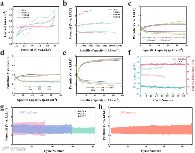 提升电催化性能:优化后的Pt@GCA电极展现出超高放电比容量(>10 mA h cm⁻²)、低过电位(0.71–1.06 V)和能量效率超过80%。 -