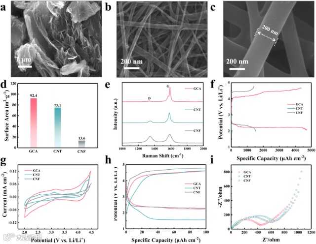 图1b–1c:SEM和XPS表征了不同基底材料(GCA、CNT、CNF)的微观结构与电化学性能,表明GCA基底在比表面积、导电性和催化效率上的优势。