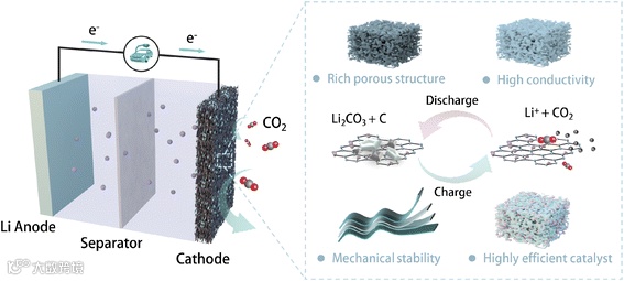 图1a:展示了锂二氧化碳电池(LCBs)的工作原理与气体电极期望特性。优化电极的关键是具备高导电性、催化活性和机械稳定性,以提升反应效率并降低副反应。 -