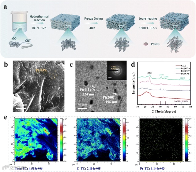创新性电极设计:采用三维多孔的石墨烯/碳纳米管气凝胶(GCA)基底,并通过焦耳加热技术成功负载超细铂纳米颗粒(Pt NPs),构建了高效催化电极。 -