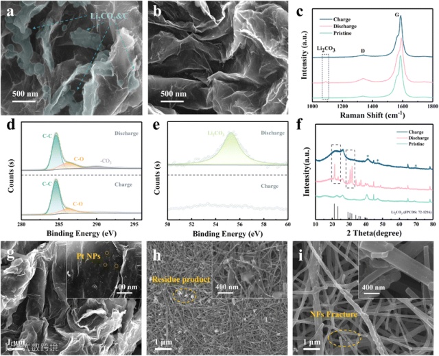 图4a–4c:SEM与XPS分析揭示了Pt@GCA电极的优异可逆性。放电产物在充电过程中完全分解,表明电极材料的结构稳定,具有高度可逆的反应机制。
