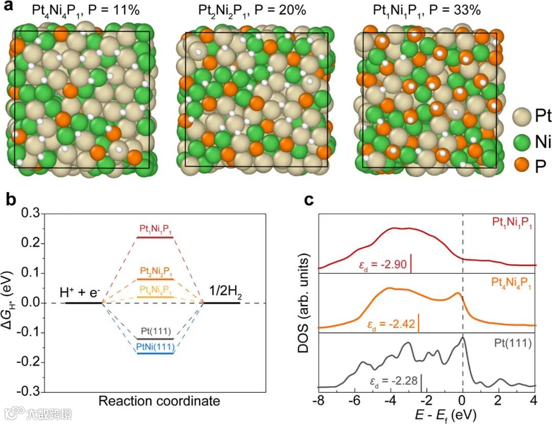 机理解析 :DFT 计算构建模型,解析 ΔG_H 与 P 含量关系,电子结构分析揭示 P 入对 Pt d 带中心影响,为性能提升提供理论依据。