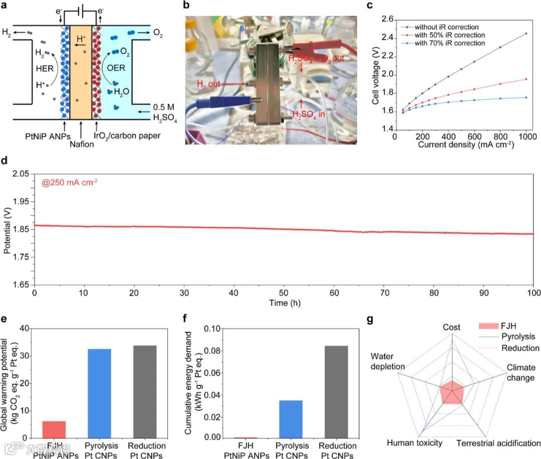 实际应用与评估 :组装质子交换膜电解槽测试,验证其实际应用性能。生命周期评估与技术经济分析凸显该工艺在降低温室气体排放、生产成本以及减少水耗与毒性影响方面的显著优势。