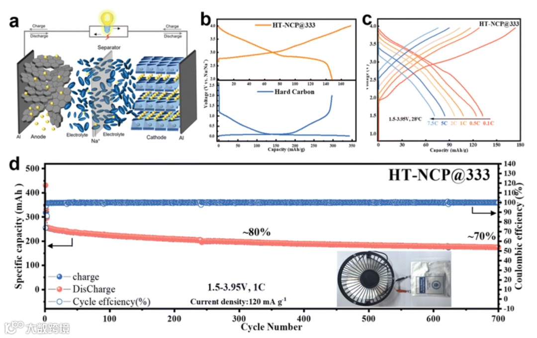 实际应用潜力:基于HT-NCP@333的钠离子软包电池展现出优异的倍率性能和循环稳定性,具有较高的商业化应用潜力。
