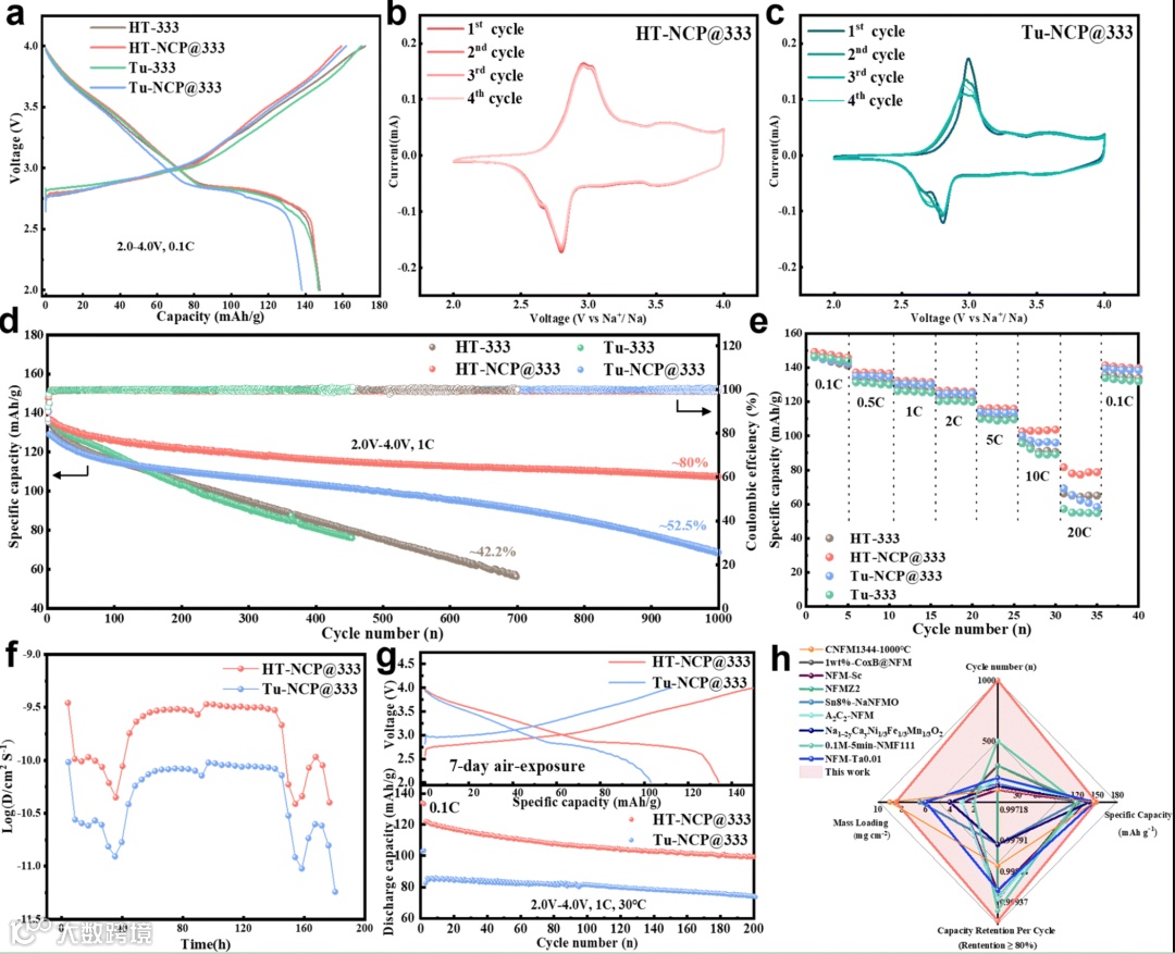 图3评估了HT-NCP@333和Tu-NCP@333的电化学性能。HT-NCP@333在初始充放电过程中表现出更高的容量保持率和稳定性。循环伏安曲线进一步揭示了HT-NCP@333在多次循环中保持稳定性能的优势,而Tu-NCP@333则因杂质的影响而迅速退化。循环性能测试表明,HT-NCP@333在1000次循环后仍能保持80%的容量,显著优于Tu-NCP@333的52.5%。倍率性能测试也显示HT-NCP@333在不同电流密度下具有更高的放电容量和更好的倍率适应性。这些结果表明,HTS方法通过提高材料的结构稳定性和钠离子扩散系数,显著提升了钠离子电池的电化学性能。