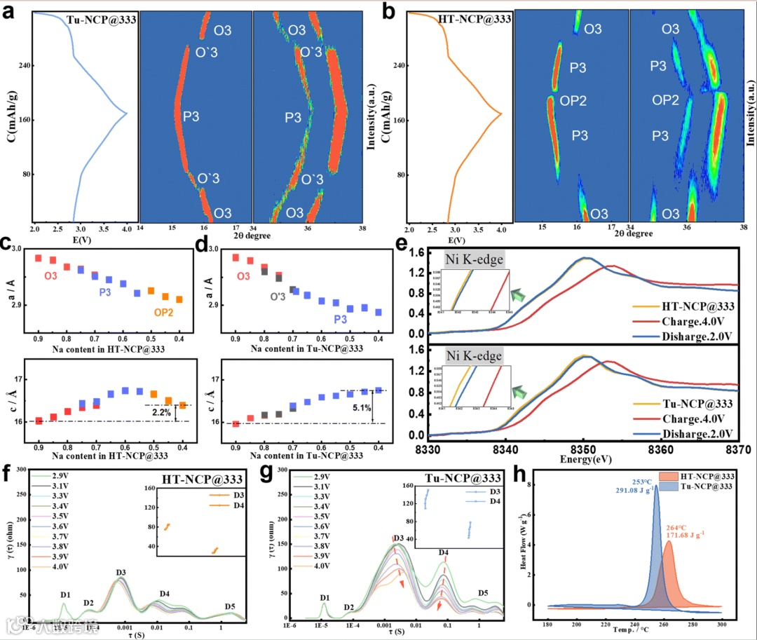 图4通过原位X射线衍射(XRD)和X射线吸收近边结构(XANES)等技术,研究了HT-NCP@333和Tu-NCP@333在充放电过程中的结构演变和电化学行为。原位XRD结果显示,HT-NCP@333在充电过程中表现出更简单的相变过程和更高的结构可逆性,而Tu-NCP@333则经历了复杂的相变,导致性能下降。晶格参数变化进一步证实了HT-NCP@333在钠离子脱嵌过程中的结构稳定性。XANES分析表明,HT-NCP@333在充放电过程中表现出更高的镍离子价态可逆性和结构稳定性。这些结果揭示了HTS方法在抑制镍迁移和提高材料结构稳定性方面的关键作用。