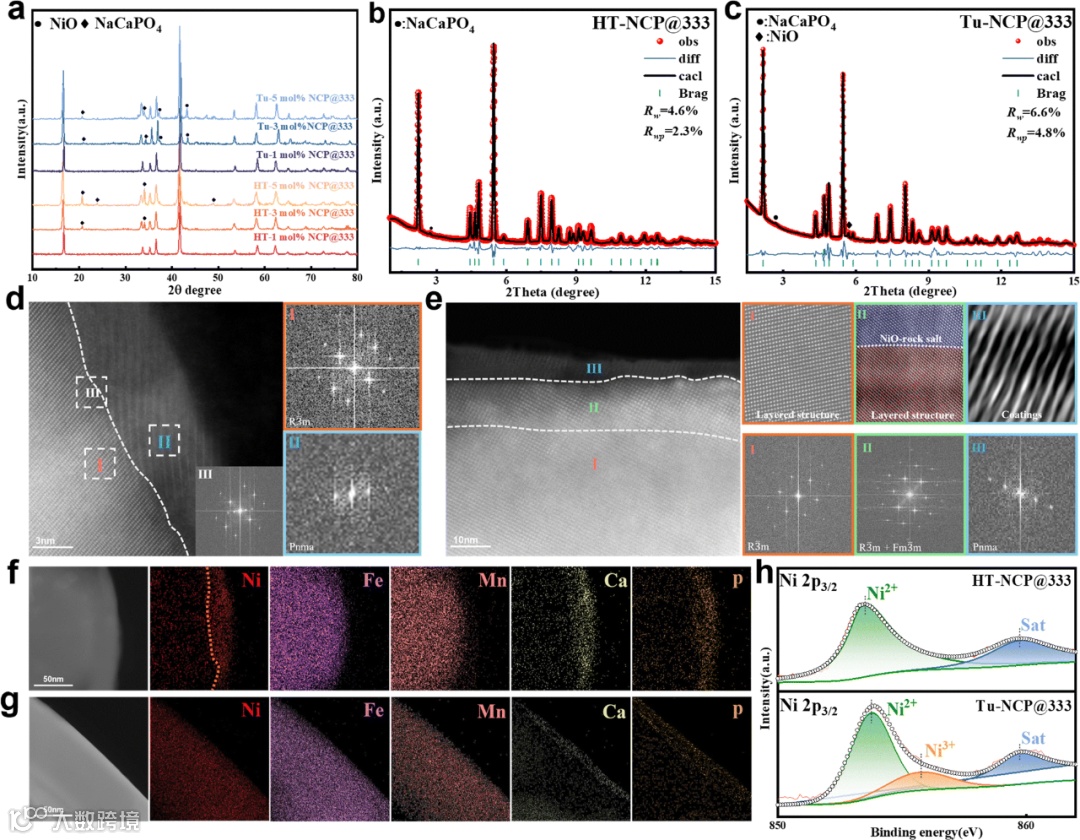 图2对HT-NCP@333和Tu-NCP@333的结构进行了详细对比。X射线衍射(XRD)图谱显示,HTS方法制备的材料表现出更纯净的相和更高的结晶质量,而管式炉方法制备的材料中出现了额外的NiO杂质峰。同步辐射XRD进一步证实了HTS方法的优越性,HT-NCP@333具有更高的相纯度和更好的晶体结构。高角环形暗场扫描透射电子显微镜(HAADF-STEM)图像揭示了两种材料的微观结构差异,HT-NCP@333具有均匀的NCP涂层,而Tu-NCP@333则存在明显的NiO岩盐相。这些结果表明,HTS方法能够有效抑制杂质的形成,提高材料的结构完整性和电化学性能。