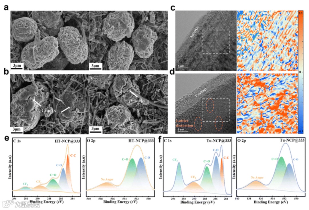 图5展示了HT-NCP@333和Tu-NCP@333在500次循环后的表面化学和结构变化。扫描电子显微镜(SEM)图像显示,HT-NCP@333表面仅有少量裂纹,而Tu-NCP@333则出现了明显的裂缝和结构破坏。透射电子显微镜(TEM)图像进一步揭示了HT-NCP@333在循环后仍保持良好的晶体结构,而Tu-NCP@333则存在显著的晶格畸变和位错。X射线光电子能谱(XPS)分析表明,HT-NCP@333表面的副反应较少,形成了更稳定的界面。这些结果表明,HTS方法能够有效抑制表面岩盐相的形成,减少结构损伤,从而提高材料的循环稳定性和电化学性能。