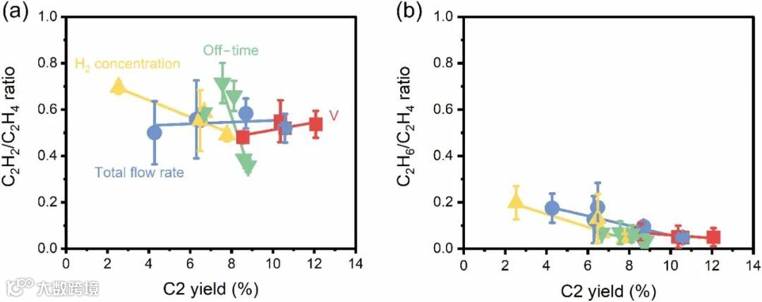 图2a,H₂浓度和脉冲间歇时间对C₂H₂/C₂H₄比例影响最大。C2收率越高,这个比例越低——尤其在H₂分压高或间歇时间长的时候。说明H₂不仅抑制乙炔生成,还在降温阶段促进乙炔加氢成乙烯。