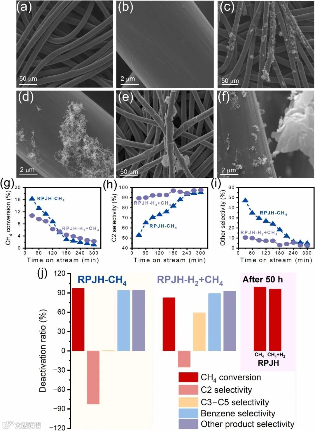 图5g-j的长期测试:5小时后,无H₂进料下甲烷转化率衰减比是含H₂的1.2倍,C2选择性衰减比更是3.6倍——H₂把碳纸“保”住了。