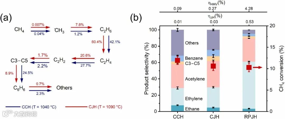 图3a的微动力学模拟:传统连续加热(CCH)等温区太长,C2产物容易进一步反应成苯;连续焦耳热(CJH)局部高温,气体停留时间短,能抑制积碳;RPJH脉冲加热,进一步把高温时间压到毫秒级。