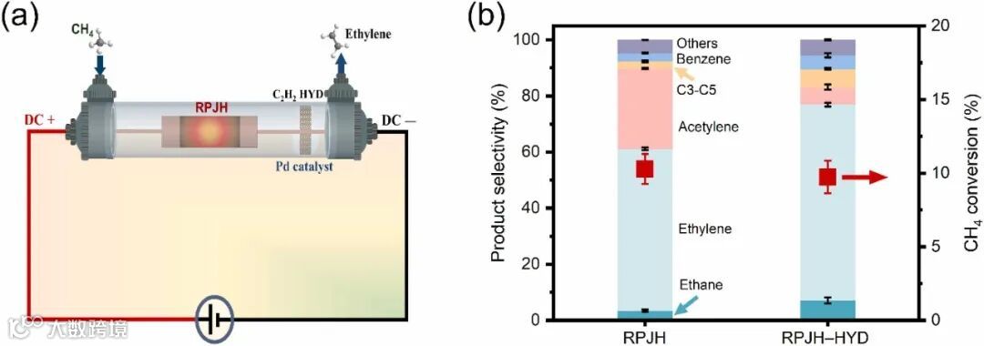 结果:C2烃选择性85.4%,甲烷转化率10.3%,电能利用效率是传统连续加热的47倍。再往下游接个Pd/CeO₂催化剂,尾气里的乙炔还能原位加氢成乙烯,总乙烯选择性提到69.9%。